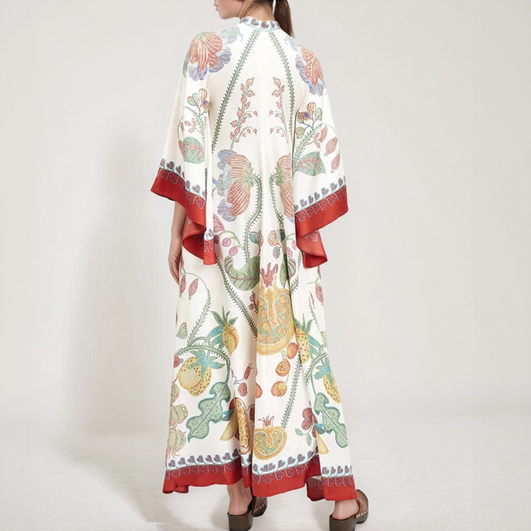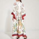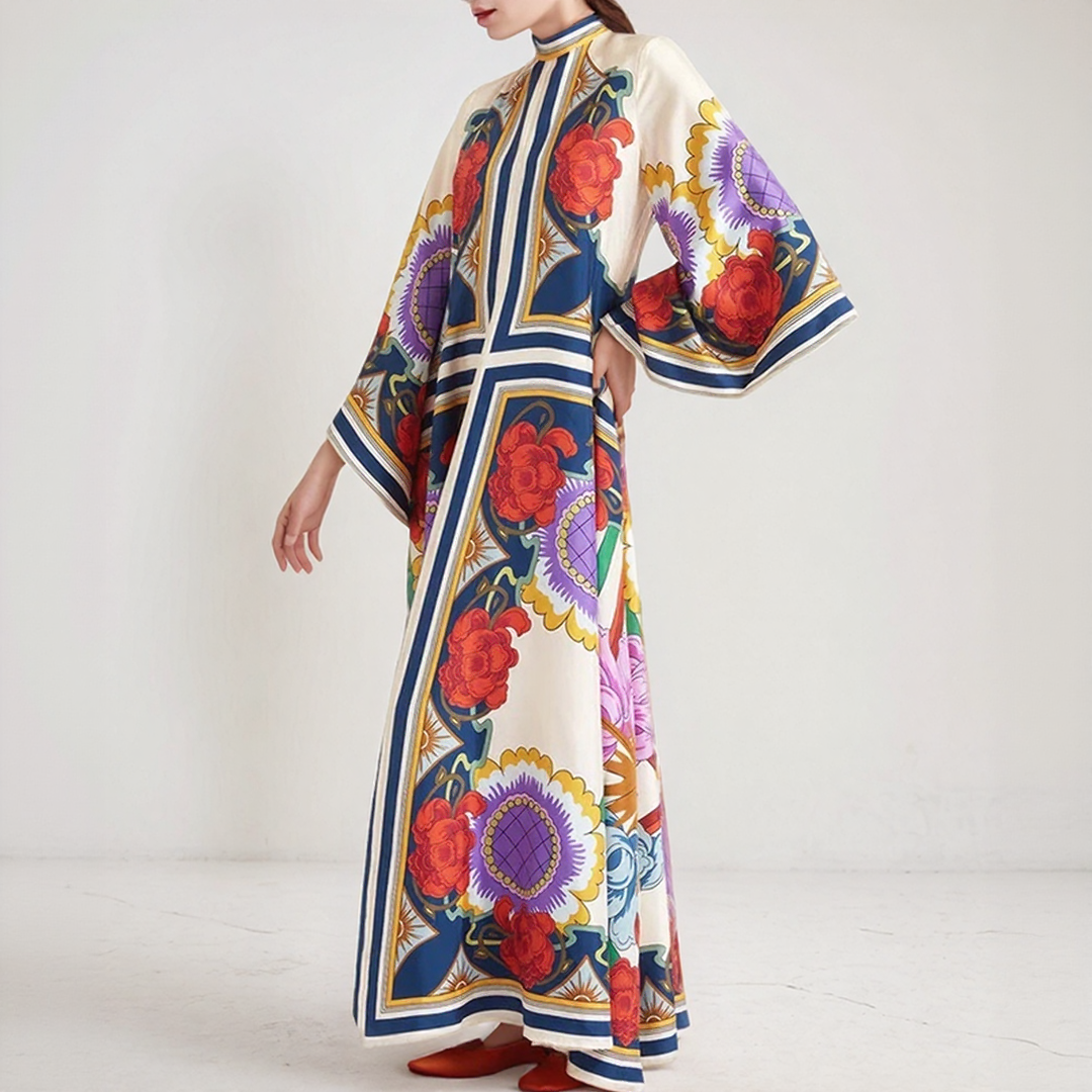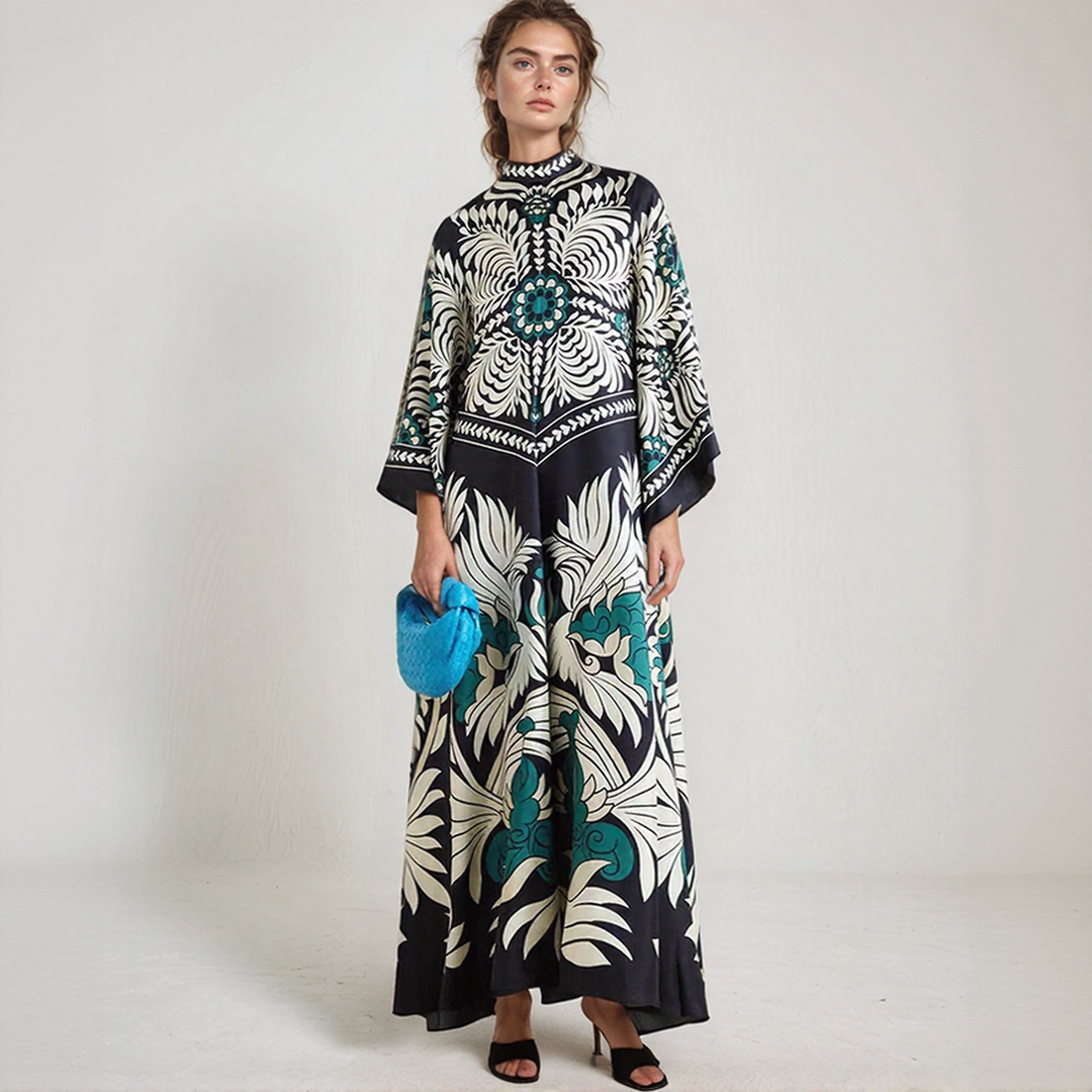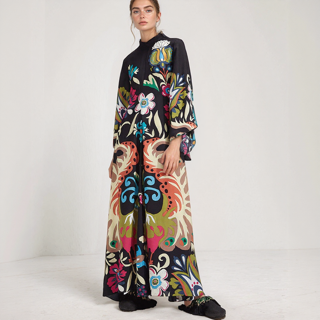 تتميز هذه الفستان الطويل بنقوش زهرية جريئة وقصة انسيابية. يضيف طوقها المرتفع مع تفاصيل العقدة في الظهر لمسة من الأناقة المتطورة. مثالية لجميع الفصول، توفر أناقة بوهيمية خالدة.