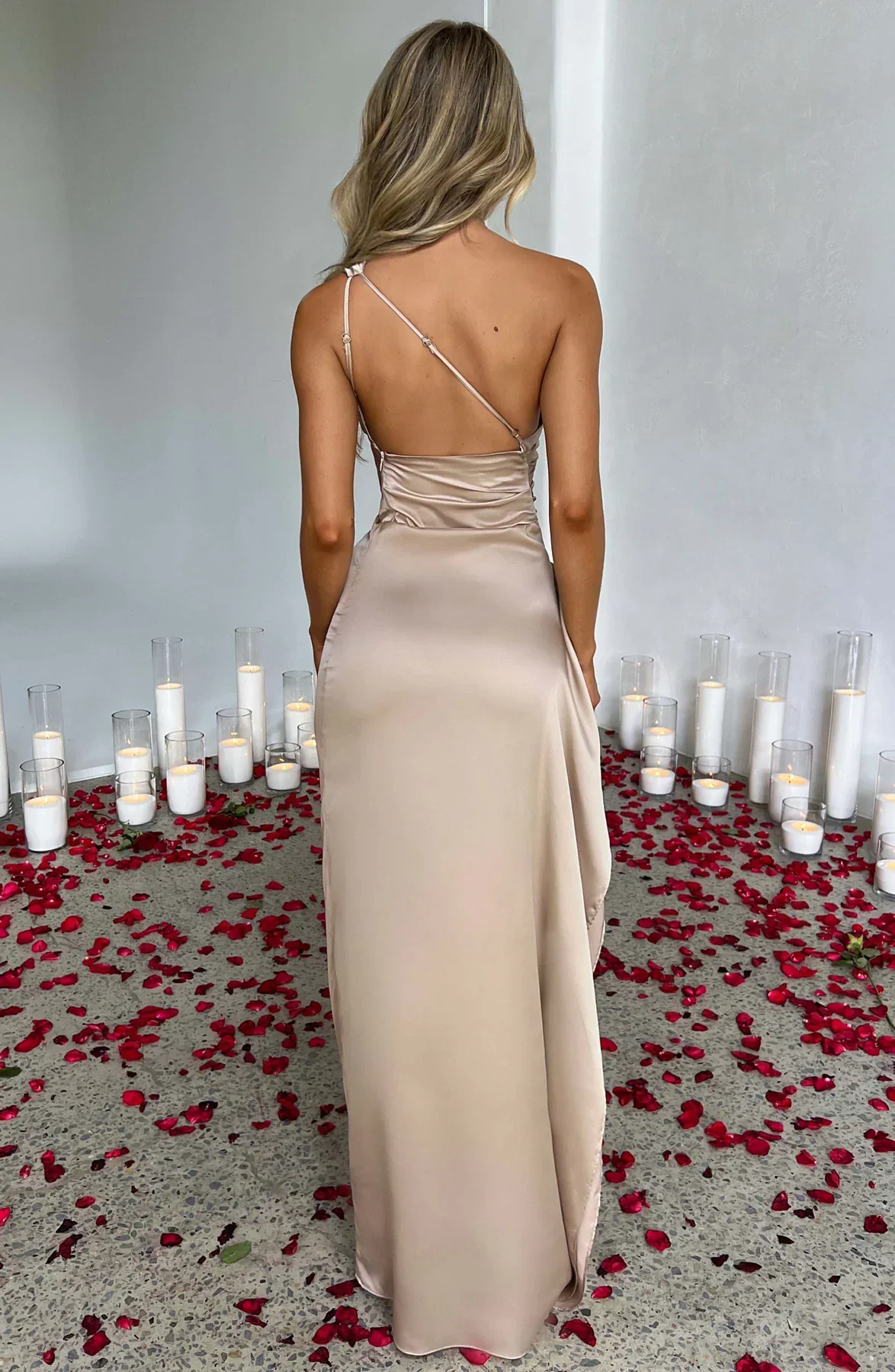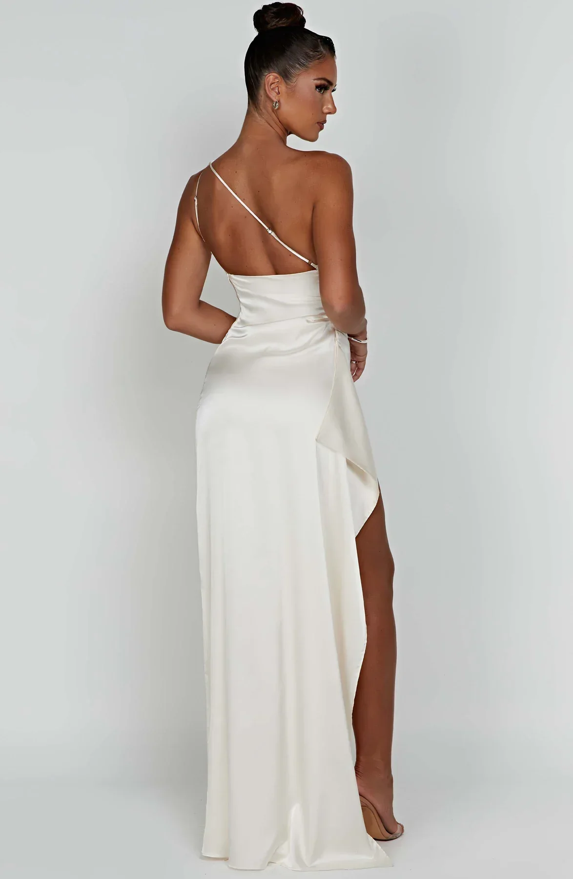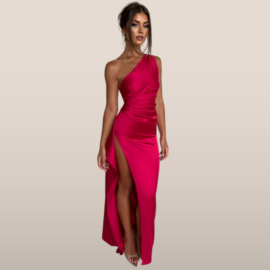 Αυτή η μακριά φόρεμα με ασύμμετρο σχέδιο ενισχύεται από μια πλευρική σχισμή. Η κομψή και άνετη γραμμή της την καθιστά ιδανική επιλογή για βραδιές και επίσημες εκδηλώσεις.
