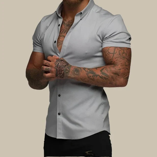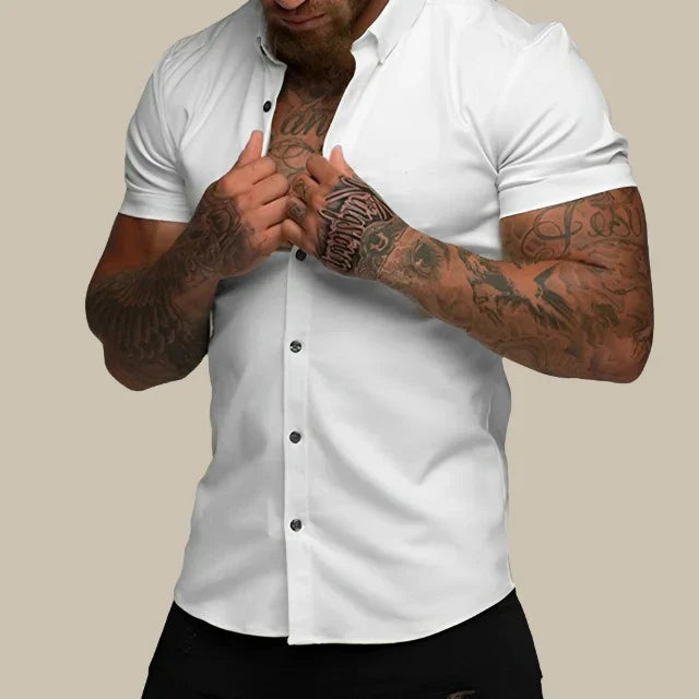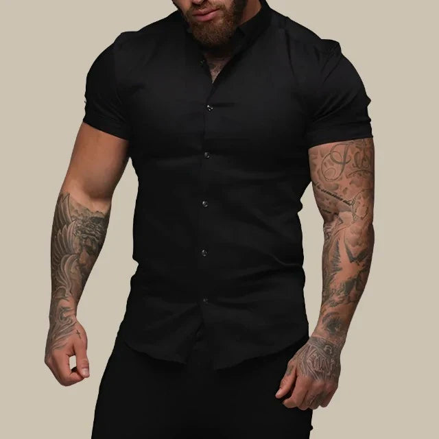 Αυτή η εφαρμοστή πουκαμίσα συνδυάζει τη σύγχρονη κομψότητα και την άνεση. Κατασκευασμένη από premium ελαστικά υλικά, προσφέρει ευελιξία και εκλεπτυσμένη εμφάνιση. Τα κοντά μανίκια παρέχουν μια κομψή και χαλαρή γραμμή, ιδανική για ζεστές μέρες.