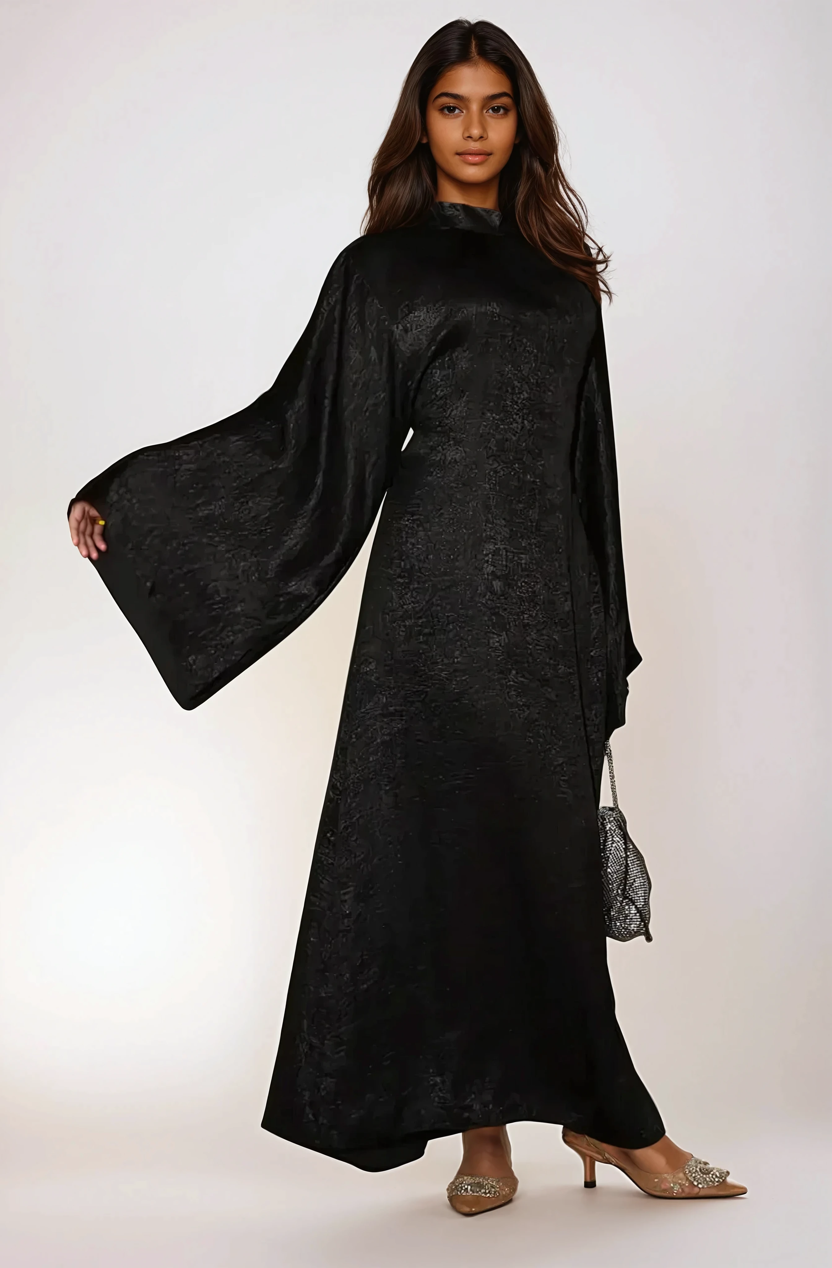 Αφεθείτε στη γοητεία αυτού του μαύρου αμπάγια με διακριτική και εκλεπτυσμένη αίσθηση. Η μακριά και ρέουσα γραμμή του αναδεικνύει όλες τις σιλουέτες, ενώ η διαχρονική μαύρη απόχρωσή του το καθιστά ένα κομμάτι-κλειδί τόσο για επίσημες εκδηλώσεις όσο και για καθημερινές εξόδους.
