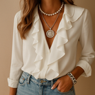 Αυτή η μπλούζα διαθέτει λεπτούς βολάν και μακριά μανίκια για μια θηλυκή εμφάνιση. Η ρευστή γραμμή της εξασφαλίζει άνεση καθ' όλη τη διάρκεια της ημέρας. Διαθέσιμη σε πολλές αποχρώσεις για να ταιριάζει με όλα σας τα ρούχα.