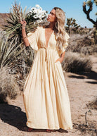 This flowing long dress offers a loose and light fit. Its plunging neckline highlights the silhouette. Perfect for summer days or elegant evenings.