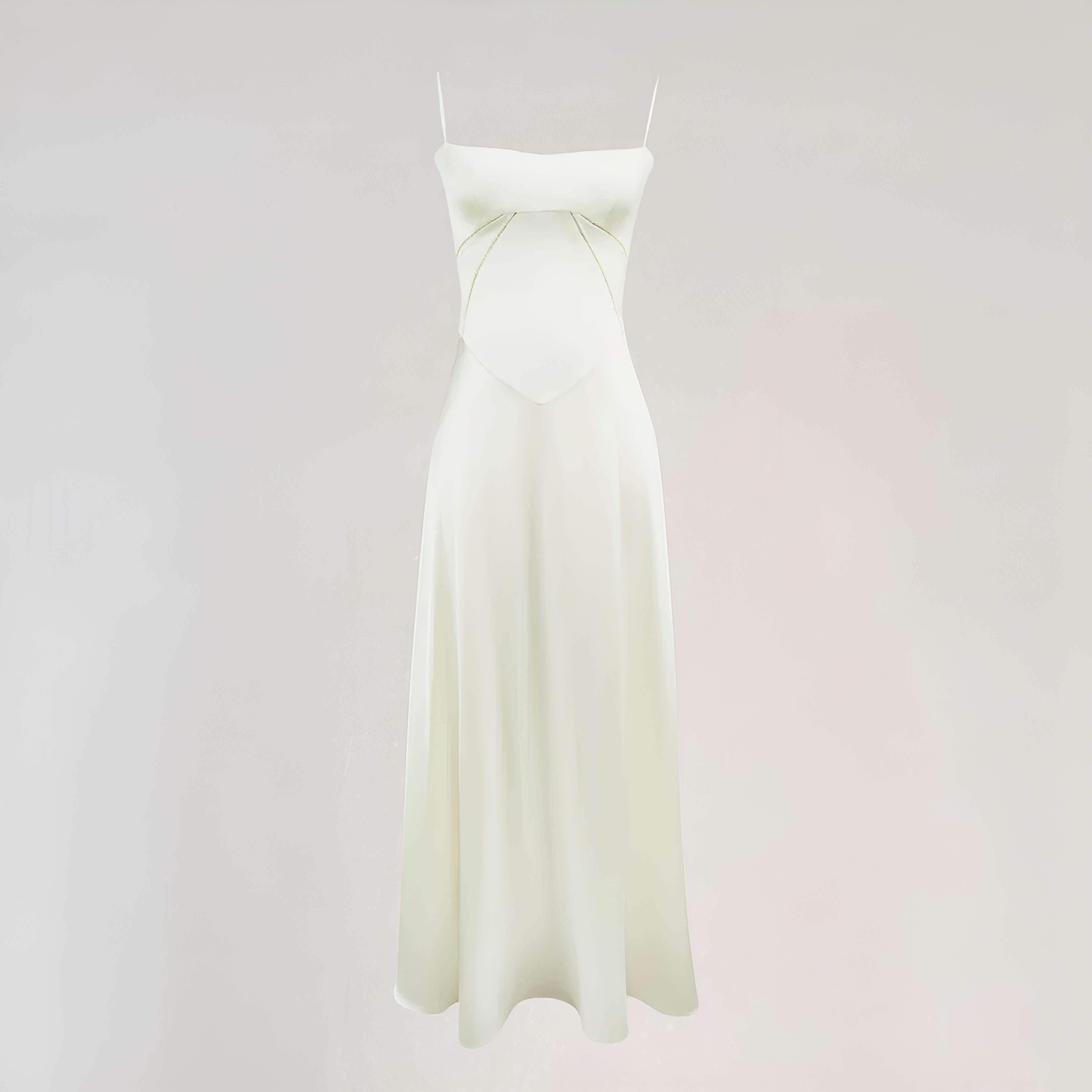 This long dress enhances the silhouette with its corset-style bodice that delicately highlights the waist. Its fluid cut adds movement and grace, while the corseted back adds a romantic and structured touch. Ideal for evenings, galas, or ceremonies.