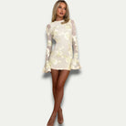 Tämä polvipituinen mekko hurmaa hienolla kukkakirjonnallaan ja hieman läpinäkyvillä pitkillä hihoillaan. Sen avonainen selkä tuo hienostunutta sensuaalisuutta, joka on täydellinen erityisiin tilaisuuksiin. Saatavilla useissa väreissä, se mukautuu kaikkiin toiveisiisi eleganssilla.