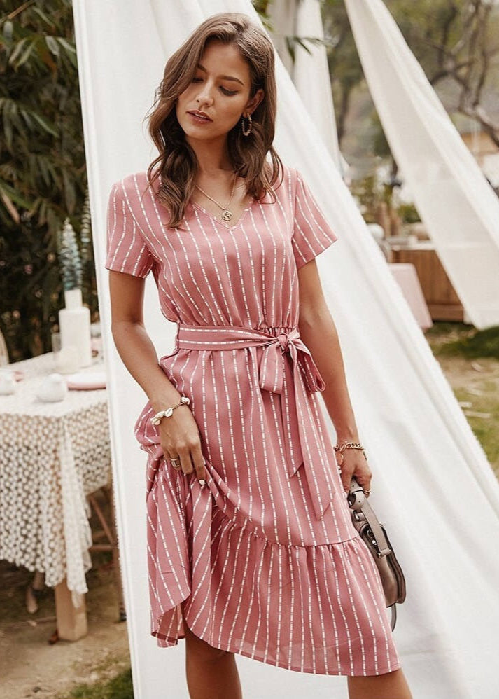 השמלה עם הפסים האנכיים מפתה בזכות הגזרה הזורמת שלה ועיצוב הנקי. הצווארון בצורת V והשרוולים הקצרים מוסיפים נופך נשי. אידיאלית לימים קיץ או לערבים פשוטים.
