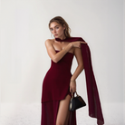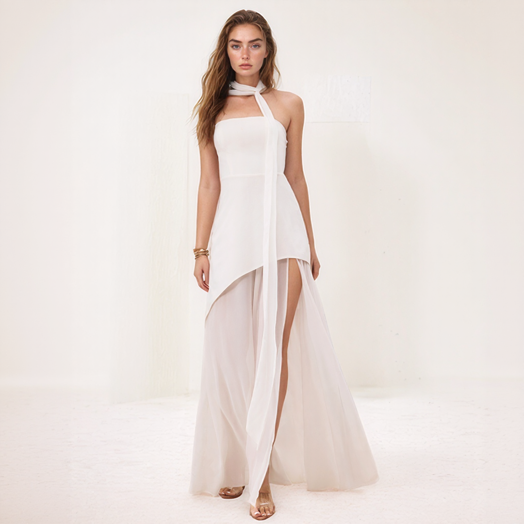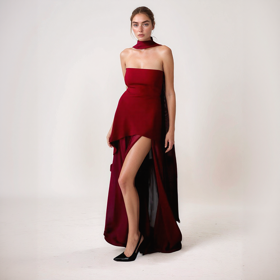נלי | שמלה ארוכה אלגנטית – חיתוך אסימטרי וצעיף משולב
