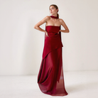 השמלה הארוכה האלגנטית מציגה גזרה אסימטרית עם שולי גבוה-נמוך ושכבה שמוסיפה עומק ותנועה. הפרט של צעיף משולב מתלפף בעדינות סביב הצוואר או מתנוסס על הכתף להשלמת מראה מעודן. עשויה מבד קל, היא מציעה צללית זורמת ונוחה.