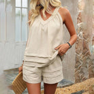 このVネックのノースリーブセットは、快適さとエレガンスを流れるようなカットで融合させています。夏の日に最適で、シンプルにカジュアルでスタイリッシュなルックを提供します。