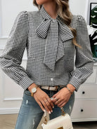 このブラウスは、エレガントなリボンディテールが施された時代を超えたチェック柄を特徴としています。長袖なので、すべての季節に最適です。コーディネートが簡単で、カジュアルな場面でもビジネスシーンでも着用できます。