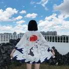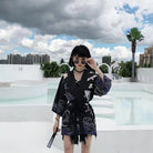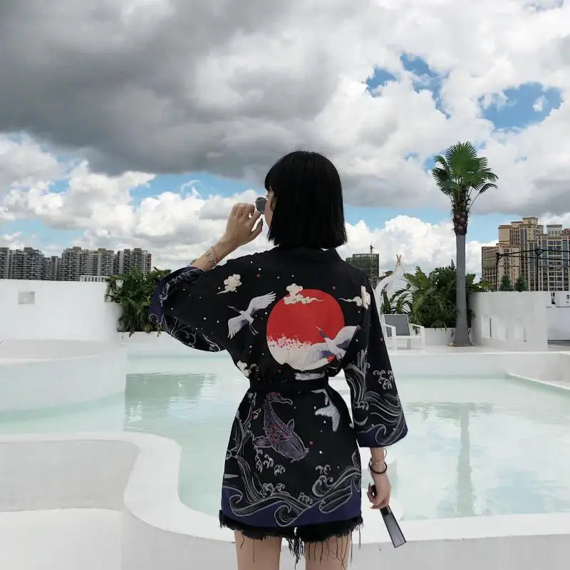 Această jachetă kimono pentru femei este decorată cu un imprimeu rafinat reprezentând păsări japoneze, simboluri ale armoniei și grației. Croiala sa largă și fluidă asigură un confort perfect, fie pentru un look casual, fie pentru o ținută mai elegantă.