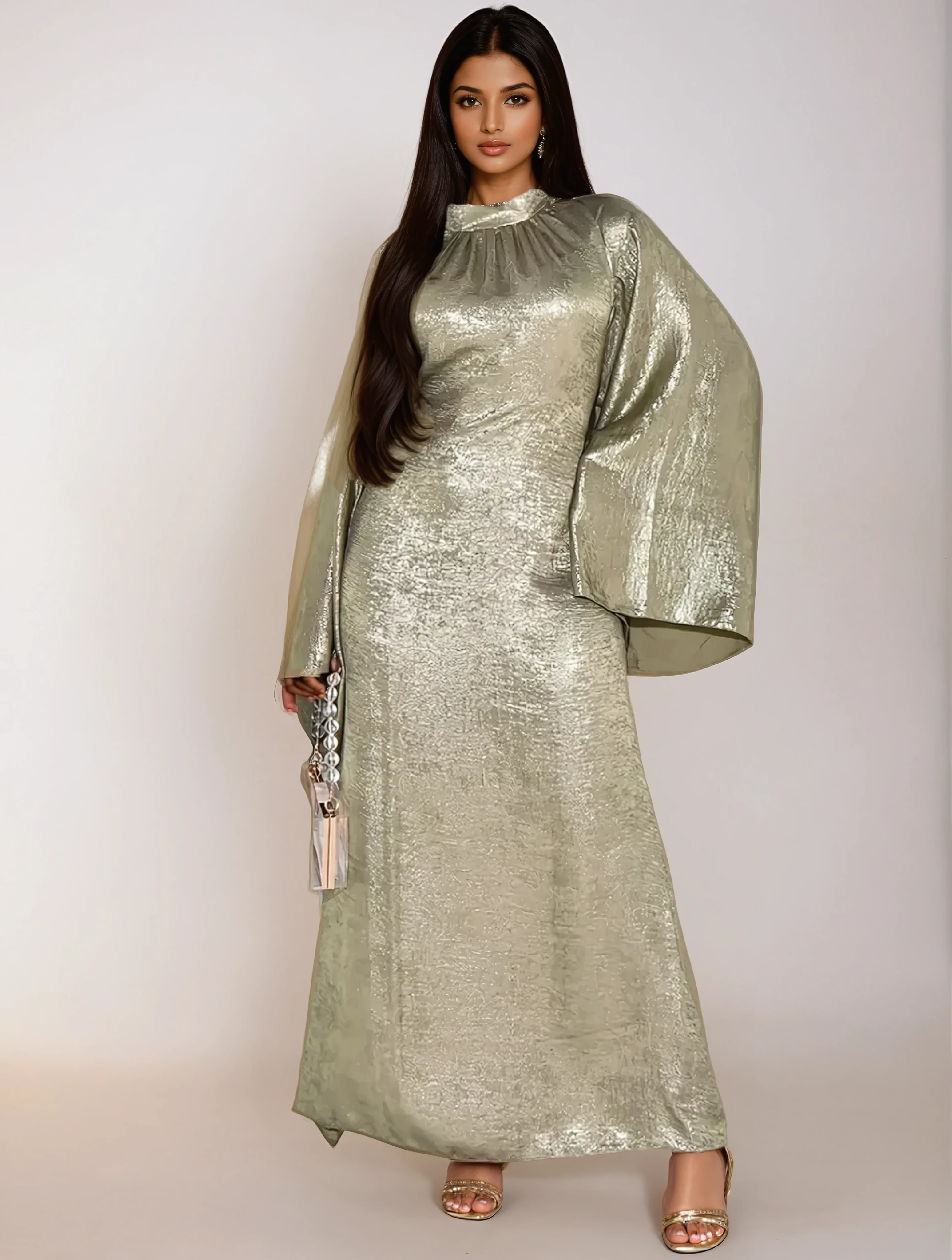 Predveďte pôvab s touto svetlozelenou abaya, ktorá je zároveň vzdušná a moderná. Jej dlhý strih, nepriehľadná tkanina a jemná farba ju robia ideálnou voľbou pre vaše špeciálne udalosti, recepcie alebo elegantné večery.