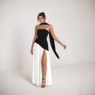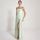Táto dlhá šaty zvýrazňuje siluetu vďaka svojmu štruktúrovanému korzetu a bezramennému dizajnu. Bočný rozparok dodáva nádych ženskosti a sebavedomia. Ideálne na elegantné večery, spája pôvab a pohodlie.
